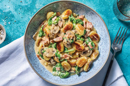 Pan-Fried Gnocchi with mushrooms spinach Serves 2-3 500 g gnocchi 200 g mushrooms 100 g spinach fresh - or frozen then thawed 50 g bacon 250 ml cream lighter versions are fine 50 g parmesan grated butter or olive oil for frying salt pepper Dice the bacon and fry until crispy in a dry pan. You can add back the bacon fat to fry the gnocchi supplement with butter if necessary or just go all-butter up to you. Heat 1 tablespoon of olive oil in a large frying pan.